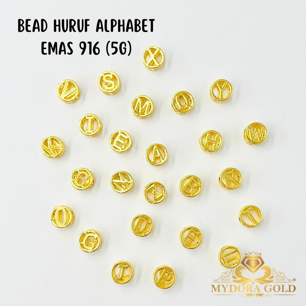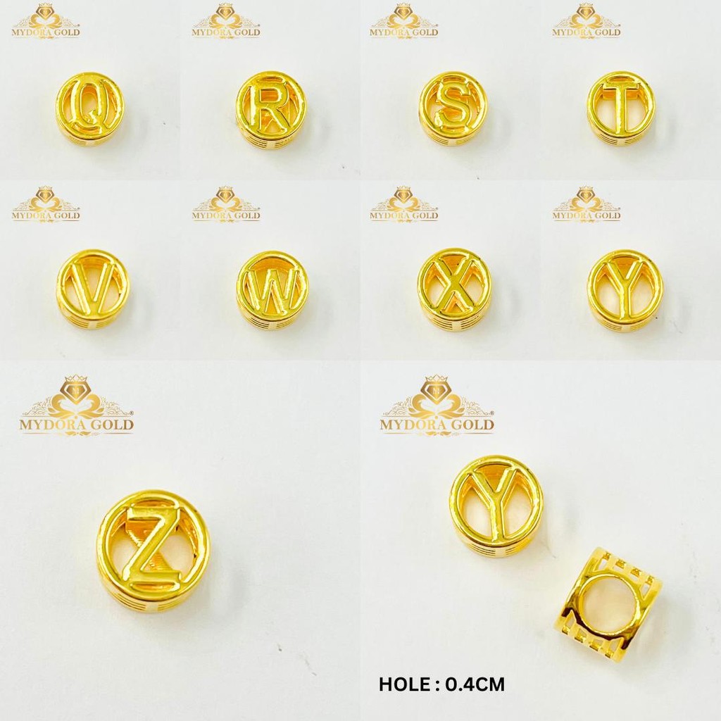 Product Info : Beads Huruf Alphabet (5G Technology -Hollow) Gold Purity : 916/22k Gold (Imported) Design A-Z Hole : 0.40cm Weight : 0.22gm +/- **HOLLOW & LIGHWEIGHT ITEM, PLEASE WEAR WITH CARE**