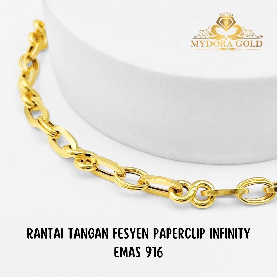 Product Info: Rantai Tangan Fesyen Paperclip Infinity Material : Emas 916 Berat: 5gm + Panjang: 18.5cm - 19.5cm **BARANG HOLLOW, SILA PAKAI DENGAN BERHATI-HATI** **HOLLOW ITEM, PLEASE WEAR WITH CARE**