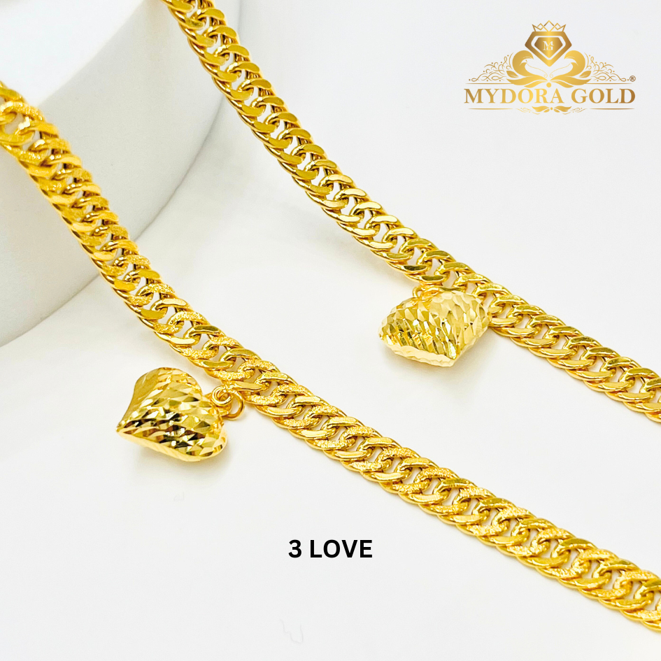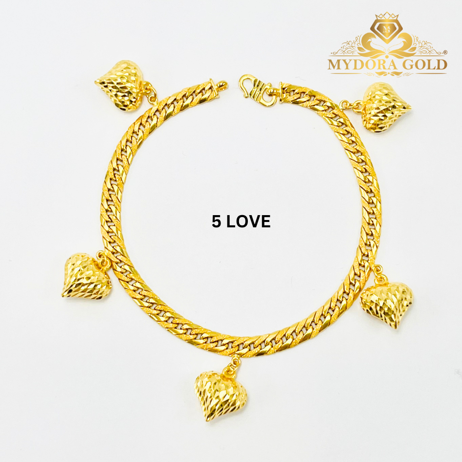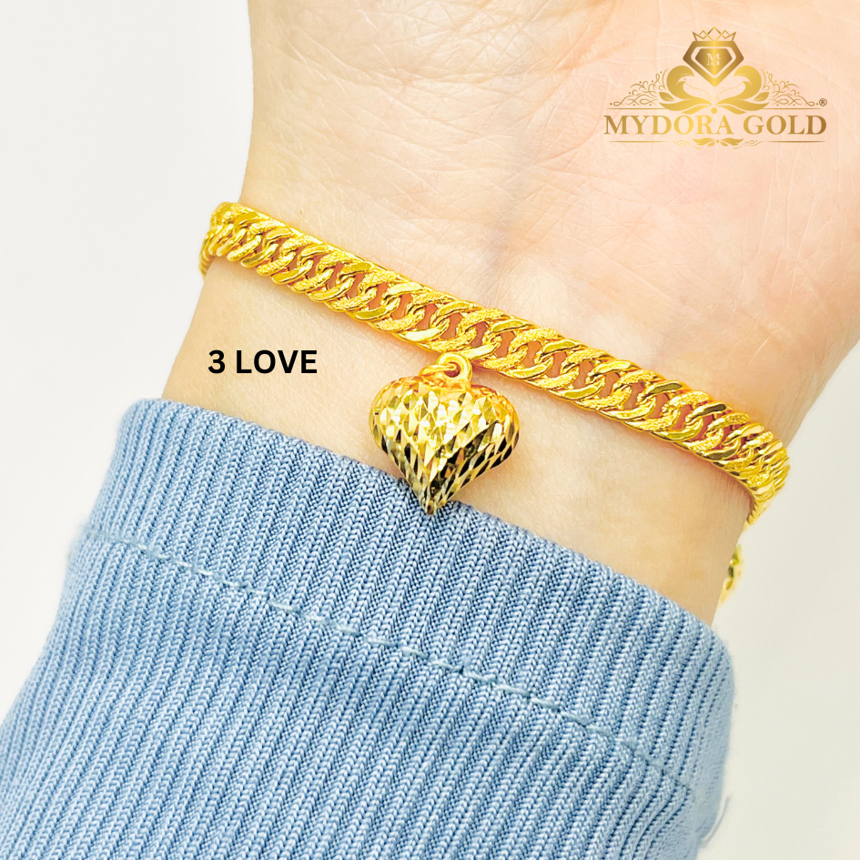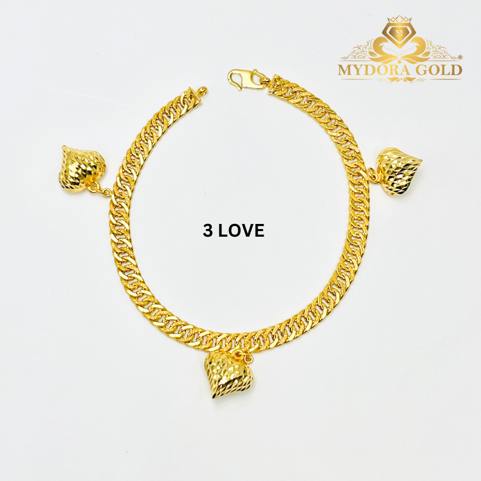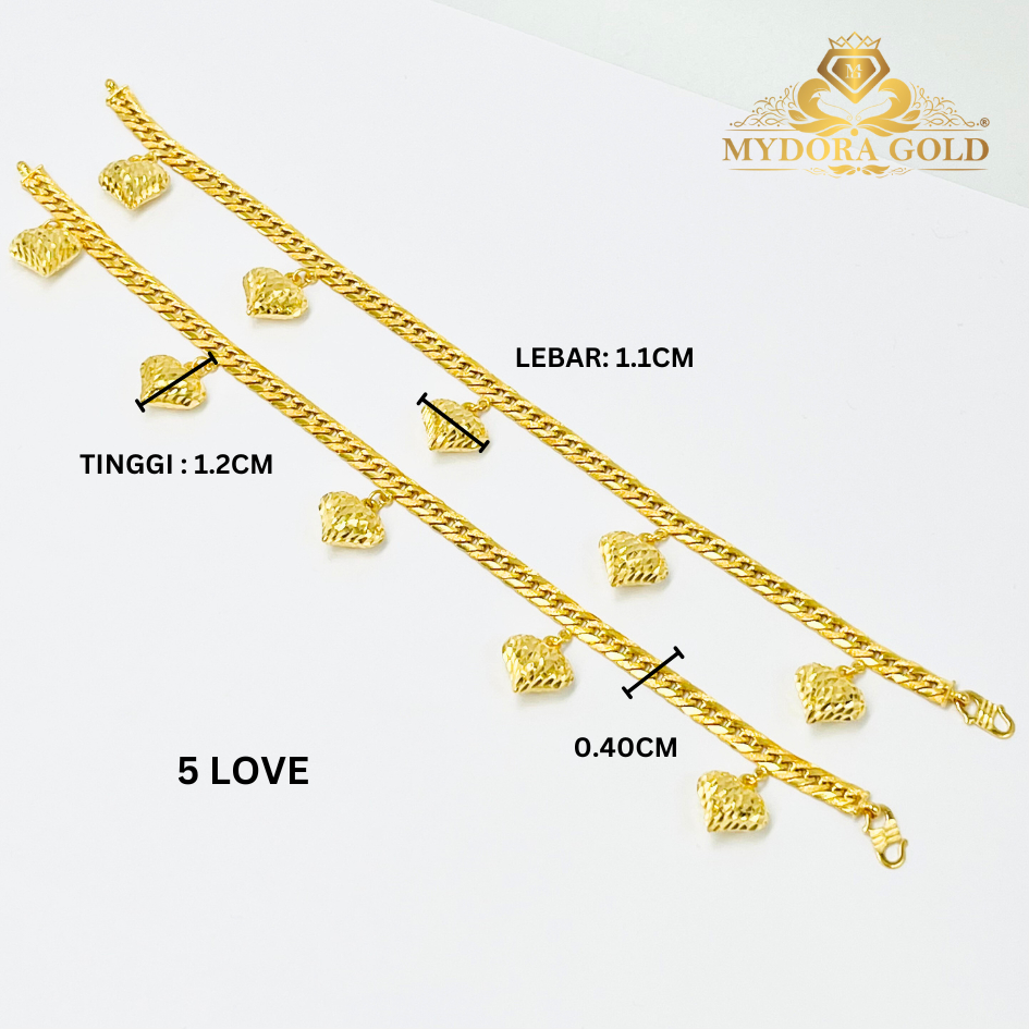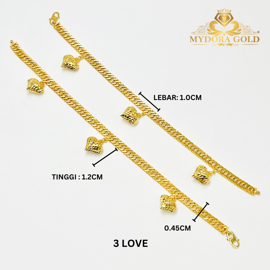 Product Info Material : EMAS 916 Gold Rantai Tangan Lipan Kait Gantung 3 Love Berat : 4g+ Size Love : 1.2cm x 1.0cm Lebar Kait : 45mm Rantai Tangan Lipan Kait Gantung 5 Love Berat : 5-6g+ Size Love : 1.2cm x 1.1cm Lebar Kait : 4mm