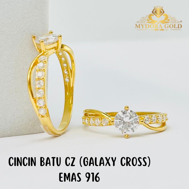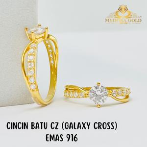 Cincin Batu CZ Galaxy Cross ini ialah cincin emas yang menakjubkan yang diperbuat daripada emas 916/22K, menampilkan batu Zirkonia yang mempesonakan dalam bentuk salib galaksi.